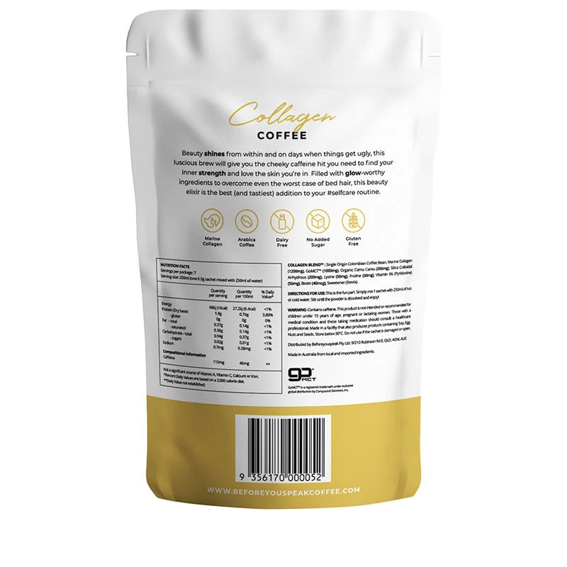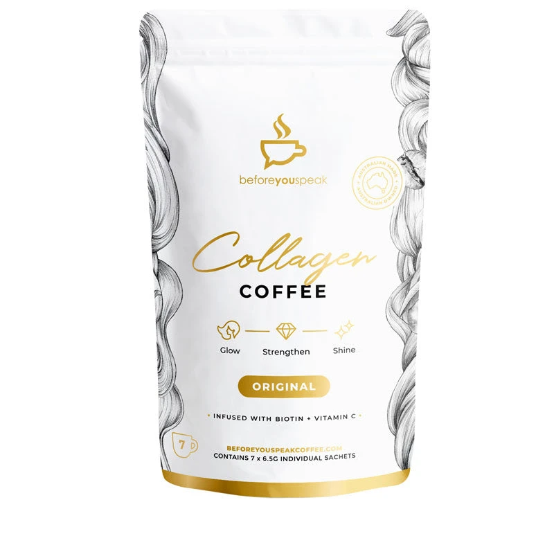 Revolutionise your morning routine with Beforeyouspeak Coffee’s Collagen Coffee. This beauty-boosting blend is infused with MCT Oil, Silica, Proline, Biotin and Camu Camu to help improve your hair, skin and nail health. Includes 7 serves.