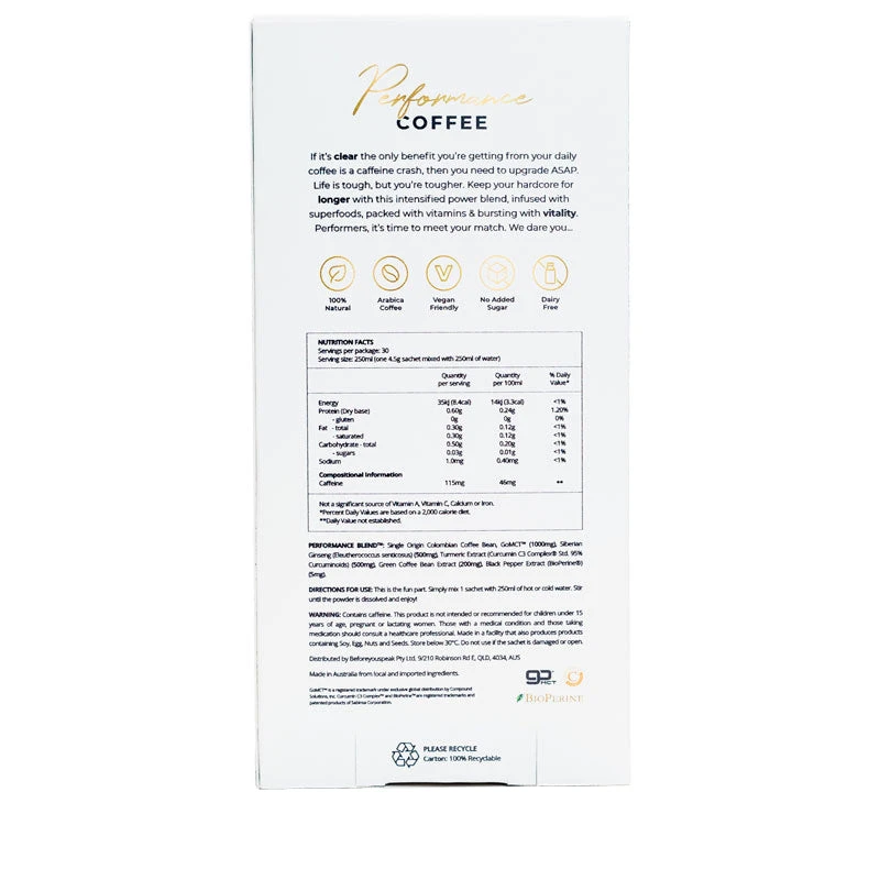 A full bodied, unsweetened instant Colombian coffee blend enhanced with performance focused ingredients to help you own the day. Infused with MCT Oil, Ginseng, Turmeric, Black Pepper & Green Coffee Bean, this premium unsweetened blend is both gluten free, dairy free and is keto & vegan friendly. Includes 30 serves.