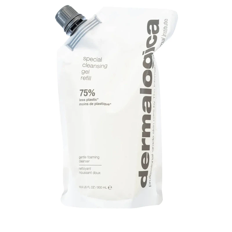 Reduce waste and refill with this refillable pouch of Dermalogica’s top-selling cleanser, Special Cleansing Gel. Using much less plastic than a bottle, this refill pouch features a resealable spout for closure as well as for an easy pour into a bottle. Ideal to refill any size bottle, this flexible pouch is made of 75% less plastic than Dermalogica’s original 500ml refill bottle and pump, making it the perfect option when its time to top-up your cleanser.