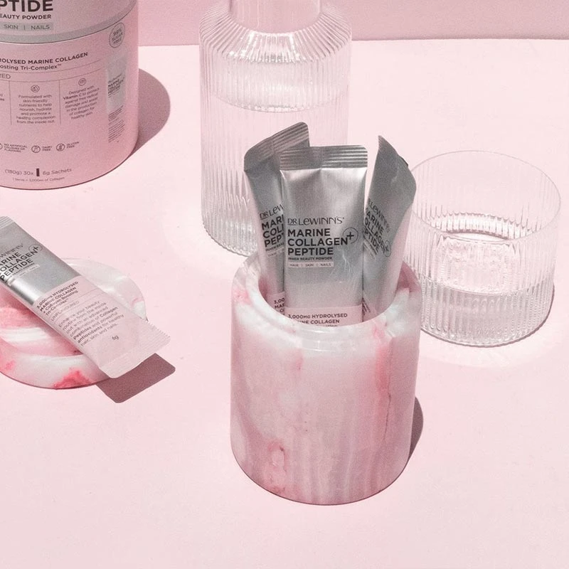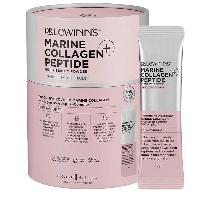 Dr. LeWinn’s Marine Collagen Peptide Inner Beauty Powder is the perfect addition to your daily routine to boost the health and regeneration of your skin, hair and nail strength. Harnessing high-quality ingredients and 3000mg of Collagen peptides and sustainably sourced Hydrolysed Marine Collagen. Taken daily this complex of Collagen will help to improve the skin’s hydration, firmness, and smoothness, as well as improve the strength of hair and nails.