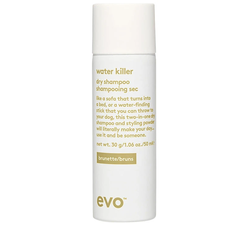 Instantly cleanse and refresh all hair types without any chalky residue with the evo Water Killer Dry Shampoo in Brunette. This two-in-one dry shampoo and styling spray works to quickly freshen the feel, look and smell of hair while replacing excess oil with effortless volume and texture. Ideal for all hair types and specially formulated for brunette hair, this dry shampoo is infused with dark pigment which blends with dark/brunette tones, providing grey coverage.