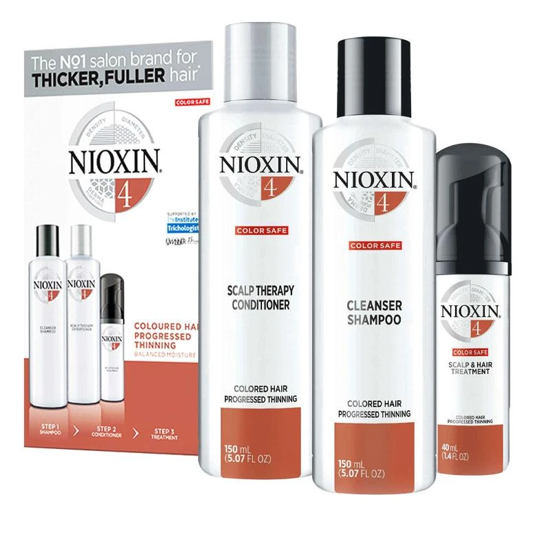 The Nioxin 3D Care Trial Kit System 4 (for coloured hair with progressed thinning) includes: