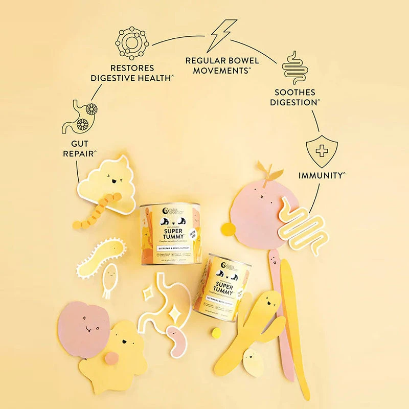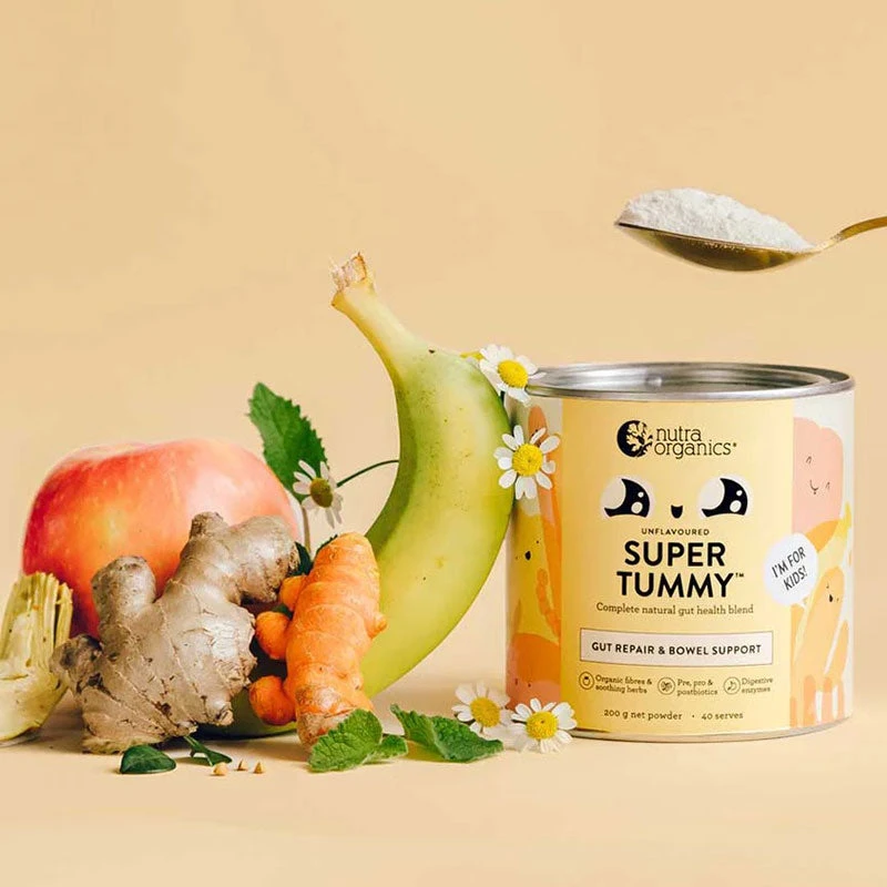 This no-fuss, all-in-one, natural gut health solution for kids has been scientifically formulated to keep little tummies happy every day. Unflavoured & easy to hide in food or drinks, this complete natural gut health blend combines scientifically researched pre, pro & postbiotics and is enhanced with fibre, digestive enzymes and soothing herbs to nurture gut health from every angle. Ideal for kids who experience digestive discomfort, Super Tummy doesnât contain any artificial nasties or refined sugar and can be easily added into food or drinks, such as juices, purees, smoothies, porridge or yoghurt.