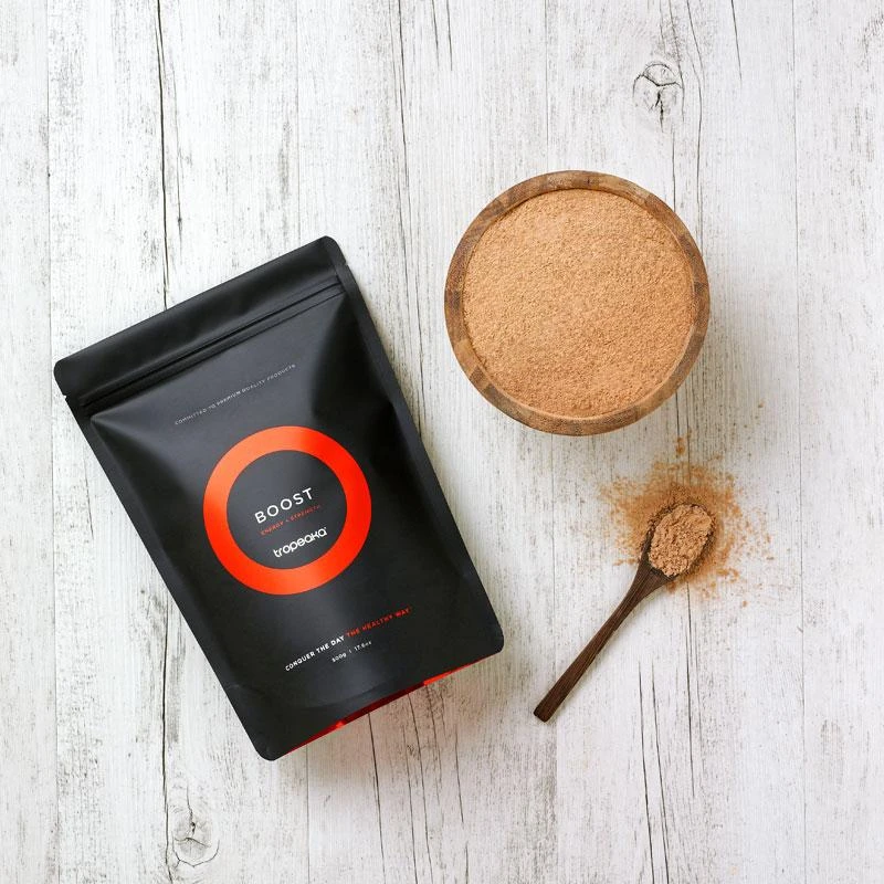 Help boost energy production and reduce feelings of tiredness and fatigue with Tropeaka’s Boost Protein. An ideal choice for anyone looking for a boost before a workout, or simply when tiredness strikes, this high protein powder provides a healthy & powerful caffeine-free vitality buzz to help pick you up and get you on your way. Rich in essential vitamins, minerals and antioxidants, this vegan-friendly formula has a delicious chocolate-caramel flavour that pairs perfectly with your favourite juice, smoothie or milk. Boosted with branched chain amino acids (BCAAS), this sustained-release formula also helps to build lean muscle while supporting collagen production for the healthy growth of skin, teeth and bones.