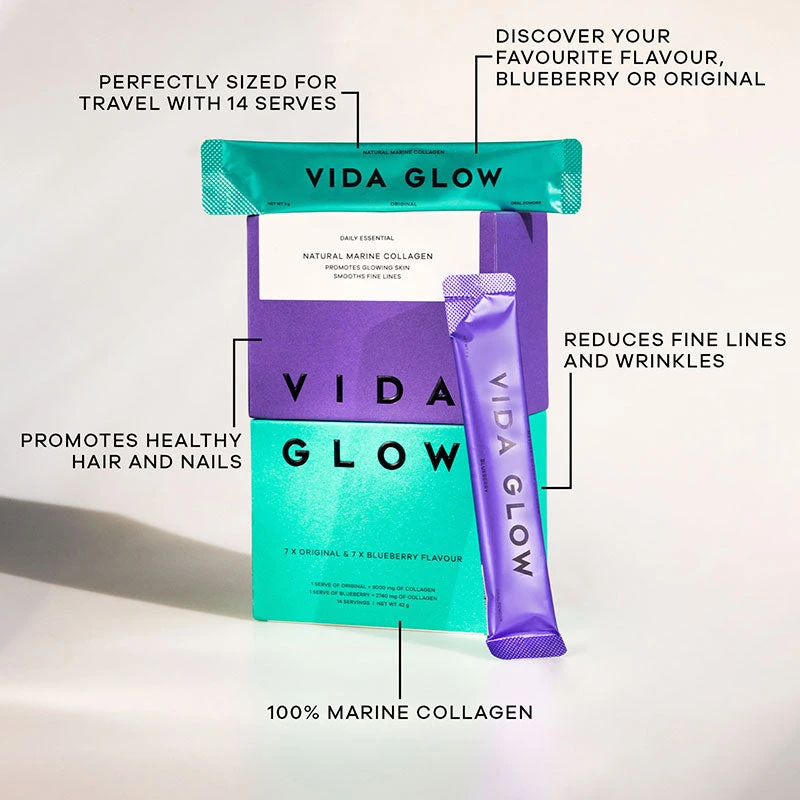 Vida Glow’s Natural Marine Collagen Sachets are your key to firm, youthful skin, strong nails as well as full hair. Containing both a Flavourless and Blueberry option, this revolutionary formula assists with preventing wrinkles, fine lines and boosting overall skin elasticity. This trial pack is the perfect launch into ingestible beauty, with 14 on the go sachets that can be added to your favourite hot or cold beverage.
